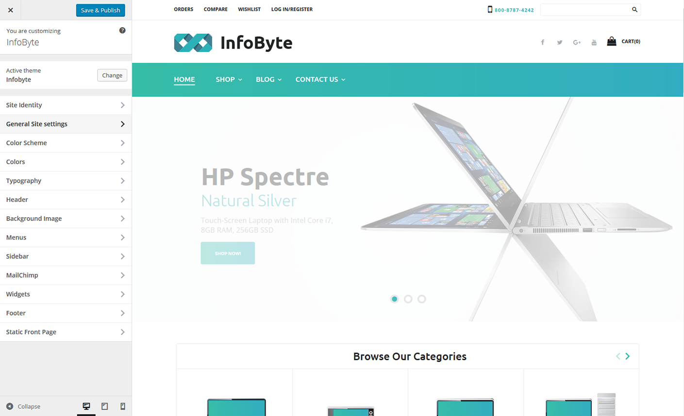 Left side of the site interface lists the available settings. Page template is displayed at the right side of the screen. After adding the changes you can save them by pressing the Save & Publish button.