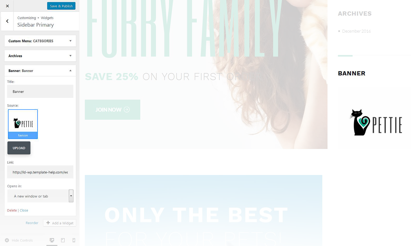 - This option allows you to add a link to a particular banner. Hover on a thumbnail in the customizer and click on the button at the middle of it to specify the address
