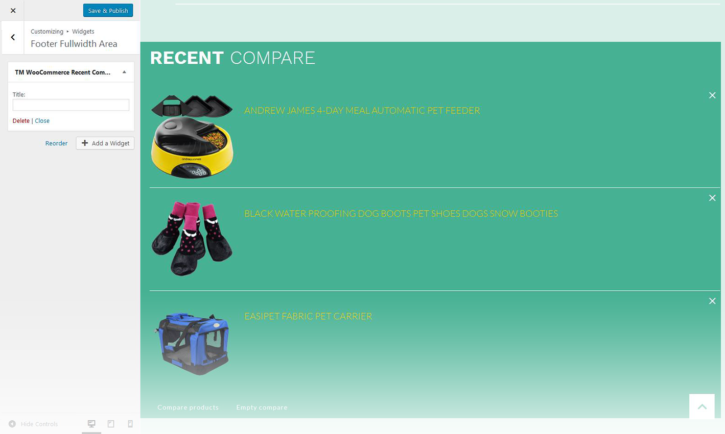 The widget shows the list of products added in the compare table.
