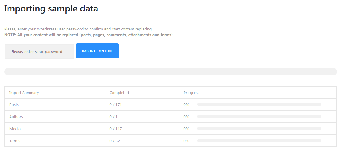 If you select Replace my existing content with demo content you will have to enter your password to confirm and start content replacing and importing sample data will start.