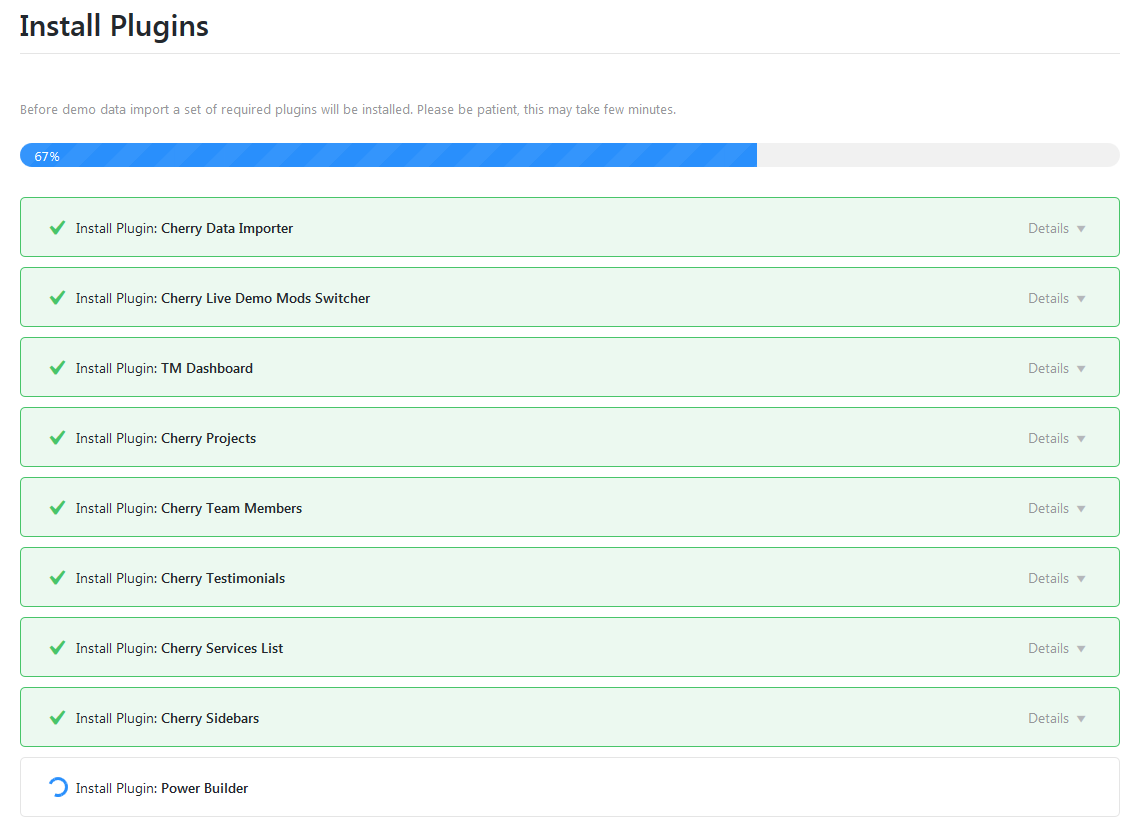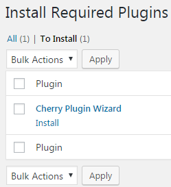 After theme activation you will get a notice which offers you to install Cherry Plugin Wizard. To continue plugins and demo contents installation with Cherry Plugin Wizard just hit Begin installing plugin link. You will be transfered to the page where you can select the needed plugins.