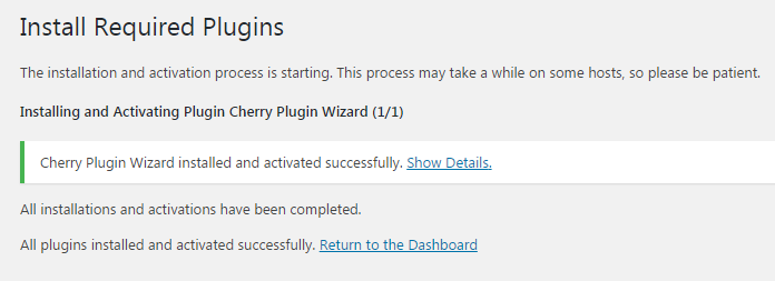After Cherry Plugin Wizard has been successfully installed and activated click on Return to the Dashboard link.