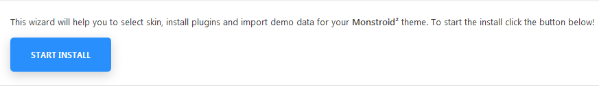 After installation and activation Cherry Plugin Wizard you will get a notice which offers you to continue the plugins and demo contents installation with Cherry Plugin Wizard. Then click on START INSTALL on the top of the page to start installation of the recommended plugins.