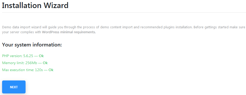 On the Wizard Home page you can check if your server configurations meet WordPress minimal requirements. If any doesnt't meet you can continue the installation process, but it will take more time and can drive to bugs.