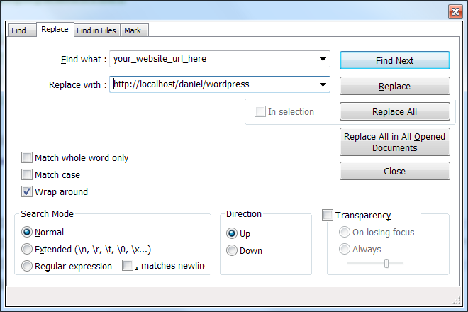 - Open the theme-name.sql file that is located in the theme/manual_install folder in any text editor (preferably Sublime Text or Notepad) and replace all instances of your_website_url_here with your website URL in the entire document using the Find and Replace tool (hit Ctrl+H hot keys to open this window). E.g.: http://www.mywebsite.com. Please, make sure that you do not have the forward slash / sign at the end of the address and the url starts with http://www. Save your changes and close the file.