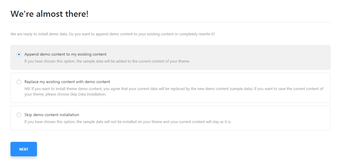 After plugins installation you will get a notice which offers to append demo content to your existing content or completely rewrite it.